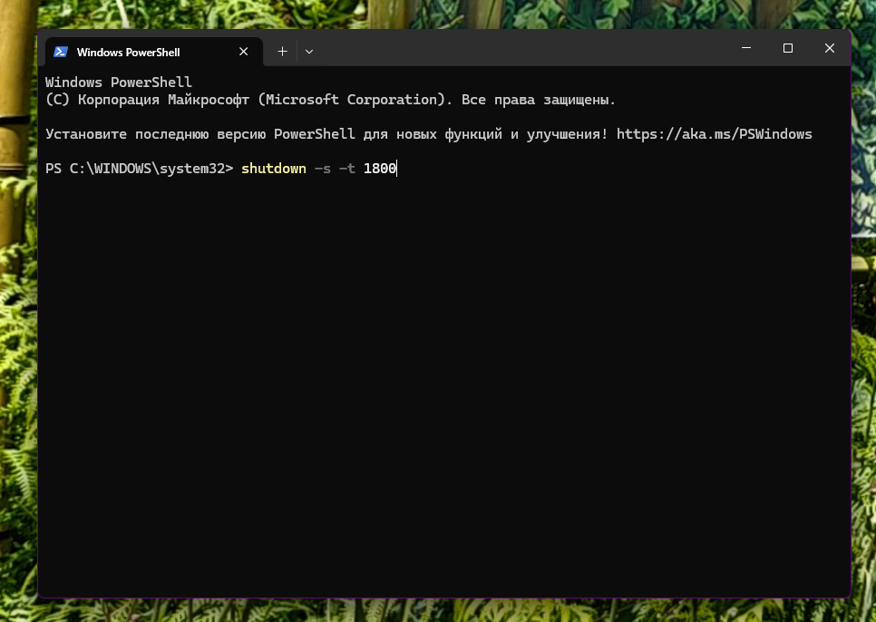 shutdown -s -t 1800). - После выполнения вы увидите системное уведомление: «Работа Windows будет завершена через 30 минут».