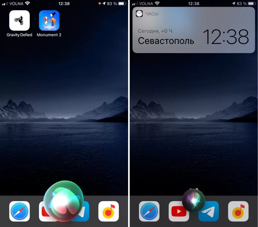 В iOS 14 компания Apple решила изменить внешний вид Siri — теперь голосовой помощник выглядит как небольшой переливающийся кружок, и ответы на вопросы он выдает прямо поверх всех программ без размытия фона: