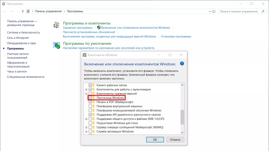 После этого зайдите в Панель управления > Программы > Включение и отключение компонентов Windows, и в открывшемся окне найдите и включите пункт «Песочница Windows»: