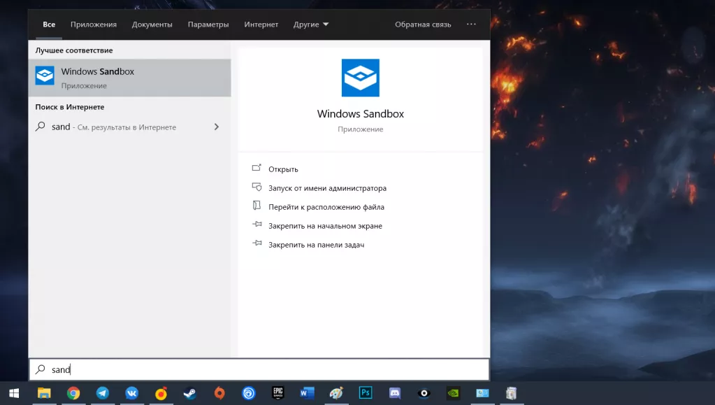 Все, после установки вам остается только перезагрузить компьютер, и Песочница будет готова к работе. Для ее запуска просто введите в поиске слово «Sandbox»:
