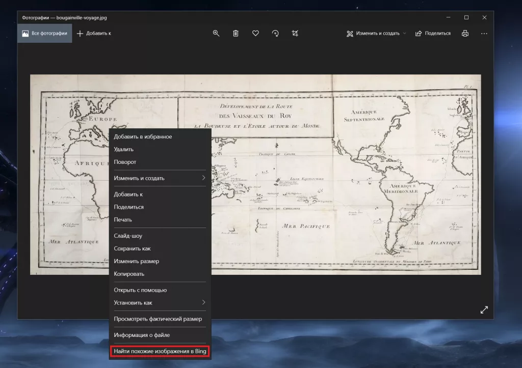Поиск по картинке давно стал привычным: с его помощью можно быстро найти версию изображения с большим разрешением, без надписей и так далее. Однако для этого приходится пользоваться соответствующими онлайн-сервисами от Google или Яндекс, куда картинки мы зачастую грузим с ПК. И Microsoft решила упростить нам жизнь: теперь можно использовать поиск по картинке прямо из встроенного просмотрщика Фотографии в пару кликов. Единственный минус — поиск происходит в Bing, который в странах СНГ работает не очень хорошо, но все еще результат достойный.