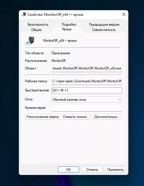 Программе также можно назначить горячие клавиши, по нажатию которых будет выключать экран. Для этого создайте ярлык программы, зайдите в его свойства, выберите поле «Быстрый вызов» и нажмите клавиши, которые вы хотите назначить на запуск Sordum Monitor Off. Нажмите OK и протестируйте работу горячих клавиш. Если всё сделано правильно, то после их нажатия экран вашего ноутбука будет моментально выключаться.