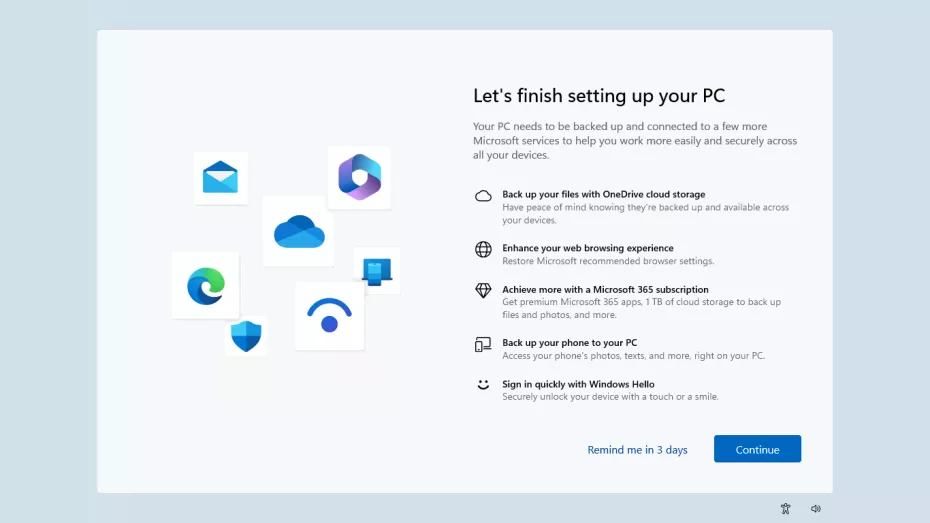 Вроде бы настройка Windows должна быть завершена сразу после установки операционной системы, но в Microsoft посчитали иначе. На этом экране в основном предлагается подписаться на дополнительные сервисы: засинхронизировать смартфон с компьютером, оформить подписку Microsoft 365 и забэкапить данные в облако OneDrive.