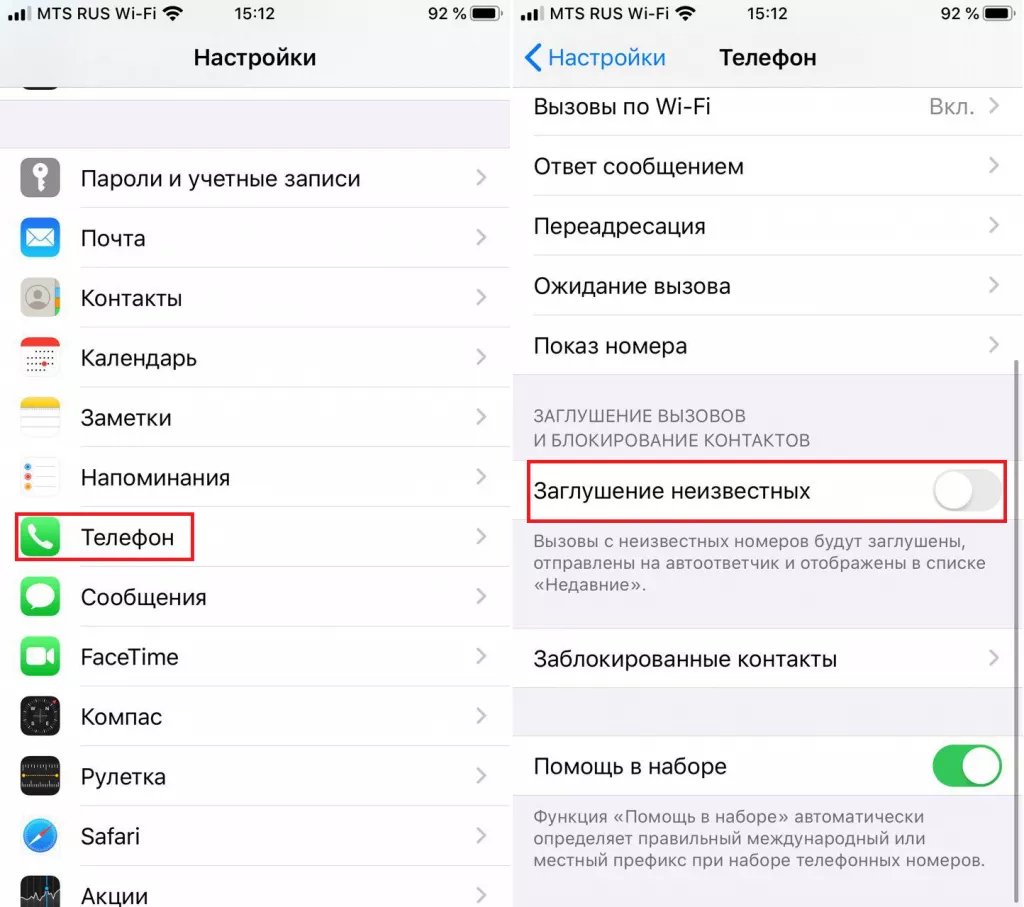 Включить эту опцию можно в Настройках > Телефон > Заглушение неизвестных: