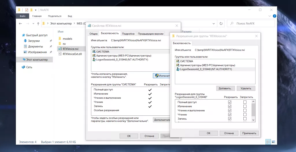 Однако при этом нужные для работы файлы уже будут распакованы — они находятся по пути C:\temp\NVRTXVoice\NvAFX. Перейдите в эту папку, найдите в ней файл RTXVoice.nvi, нажмите на него правой кнопкой мыши > Свойства > Безопасность, и дайте LogonSessionID все разрешения: