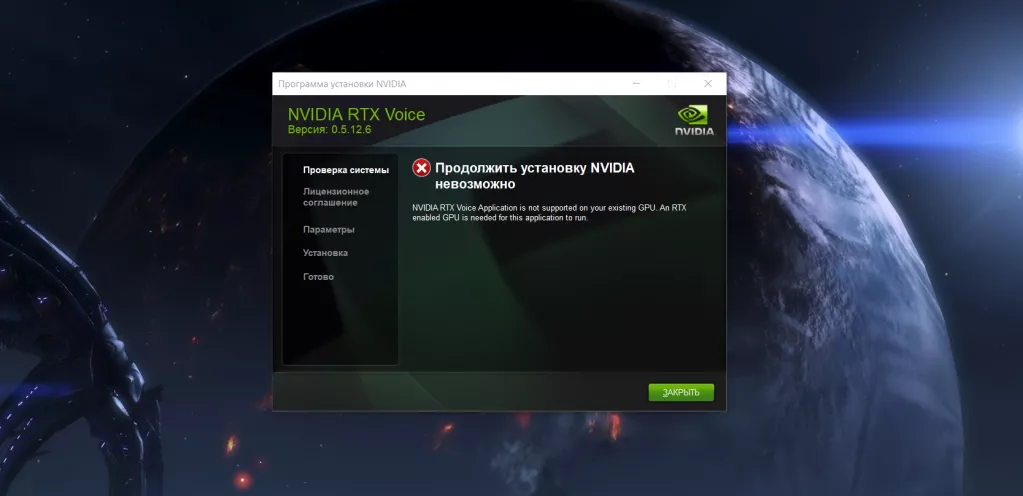 Для начала запустите установку RTX Voice. Через некоторое время установщик скажет, что ваше оборудование не совместимо с этим плагином: