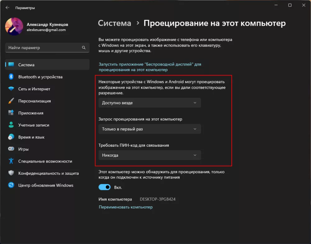 Откройте «Параметры» (Win + I), перейдите в раздел «Система», далее в «Проецирование на этот компьютер» «Дополнительные компоненты» –> «Добавление дополнительного компонента» –> «Беспроводной экран». Нажмите «Установить» и дождитесь завершения установки. Теперь вернитесь в раздел «Система» –> «Проецирование на этот компьютер», выберите опцию «Доступно везде» и установите настройки безопасности (запрос на проецирование и PIN-код, если требуется дополнительная защита).