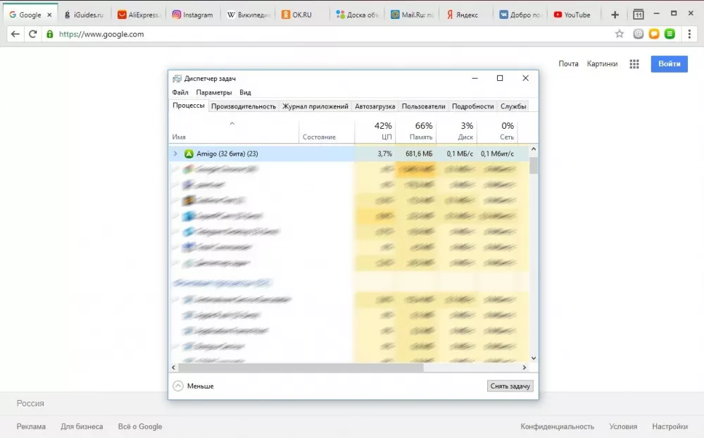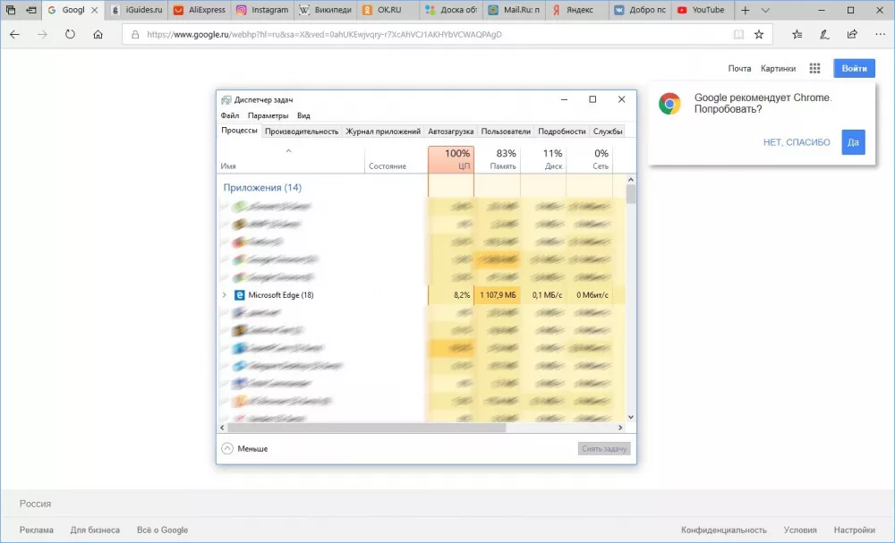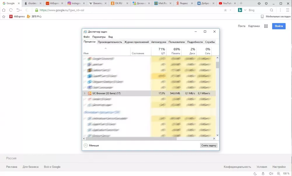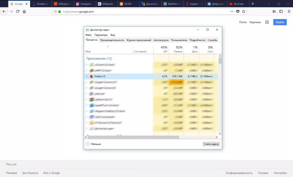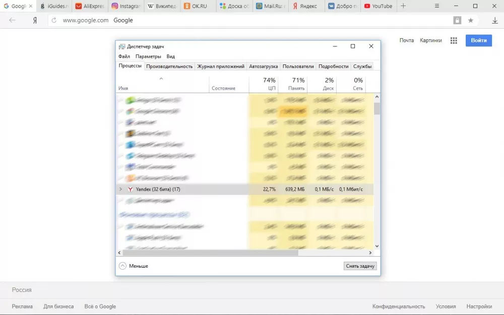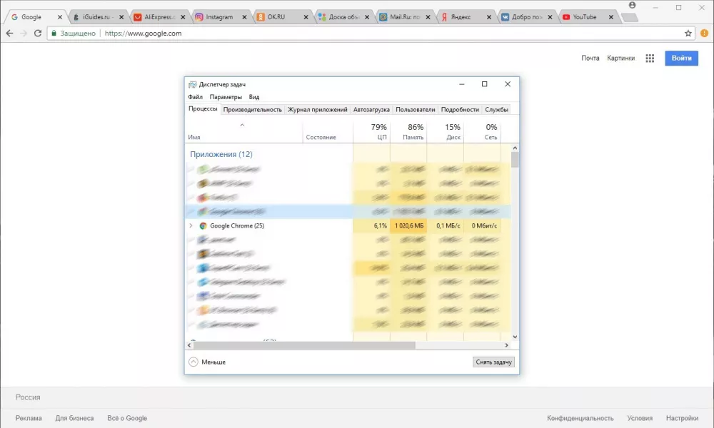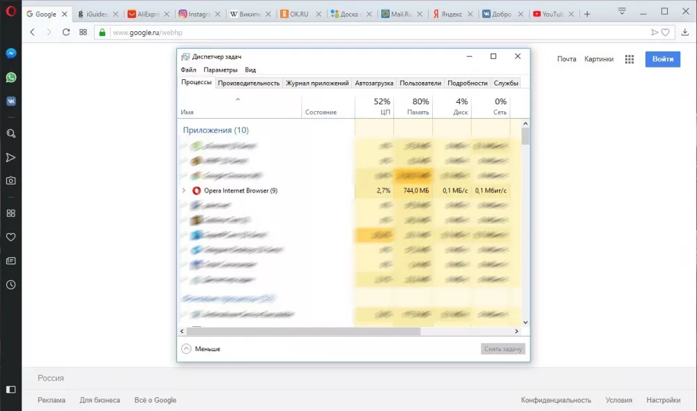 В браузерах были открыты самые популярные в России сайты: YouTube, VK, Яндекс, Google, Mail.ru, Avito, OK, Wikipedia, AliExpress, а также iGuides. Тестирование проводилось на компьютере с Windows 10, 8 ГБ оперативной памяти и процессором Intel Core i5. Результаты получились такими: