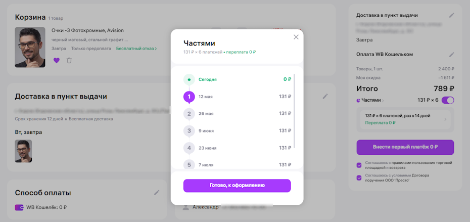 Этот способ оплаты удобен тем, что не нужно платить за товары в момент оформления заказа, первый платёж спишется только через две недели. Покупка в рассрочку есть почти у всех конкурентов Wildberries — Ozon, «Яндекс Маркета», «Мегамаркета» и AliExpress. Условия на всех площадках отличаются, но принцип примерно один — платежи делятся на несколько частей, которые нужно вносить с определённой периодичностью без переплаты или с ней. Для разных товаров могут действовать разные условия рассрочки.