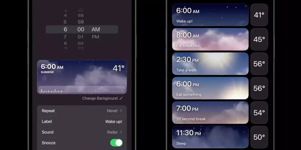 Ниже расположена плашка с динамической темой, она изменяется в зависимости от времени суток, а изображение появится при звонке будильника. Например, если выбрать тему Village и поставить время пробуждения на 3 часа ночи, на изображении будет местность погруженная во тьму, днем — светит солнце. Если зажать палец на плашке с изображением и поводить в стороны, освещение начнет меняться.
