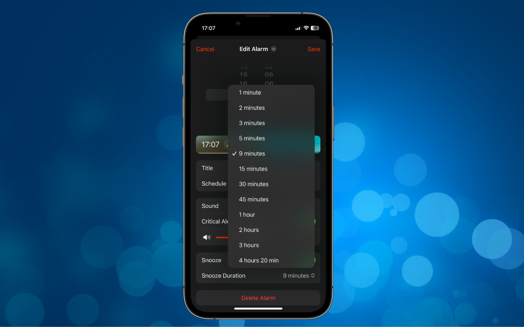 Snooze — настройка функции «Отложить». В стандартном приложении iPhone перенос будильника один — 9 минут. Здесь промежуток задается пользователем, от 1 минуты до 4 часов 20 минут.