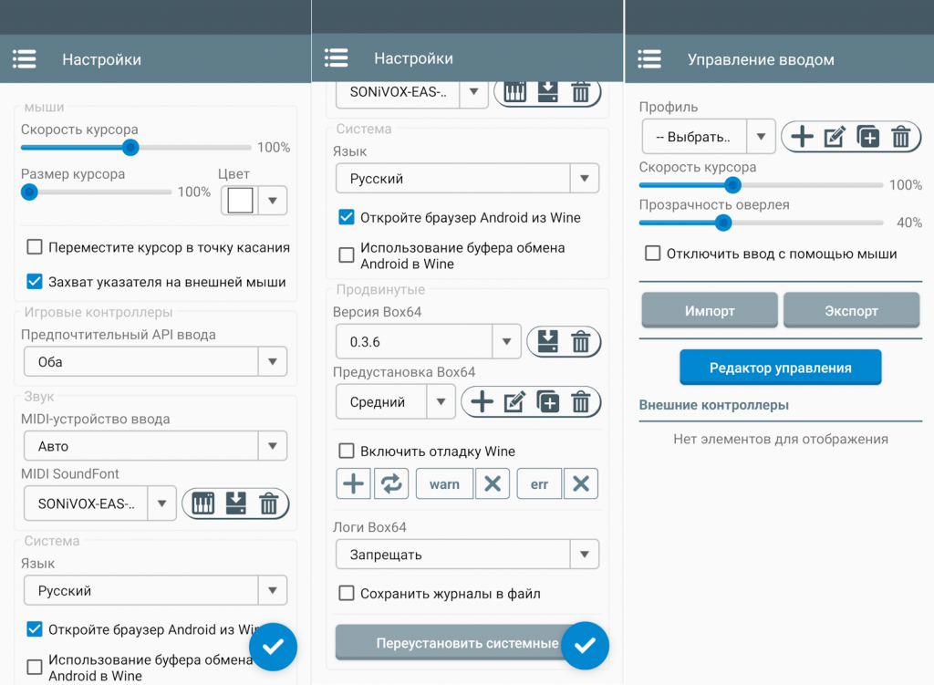 Winlator предлагает гибкую систему управления, адаптированную для сенсорного экрана.