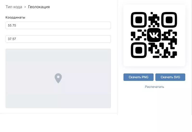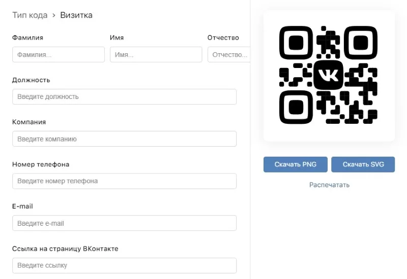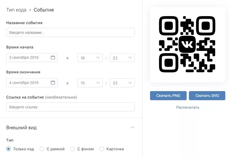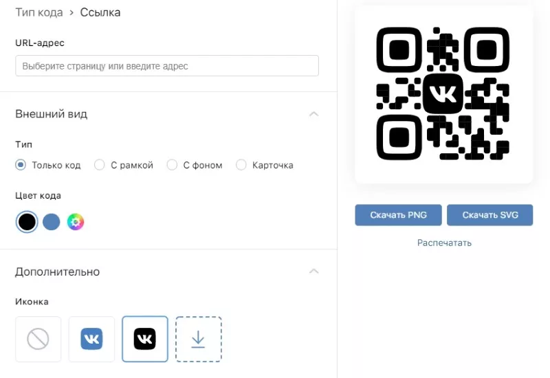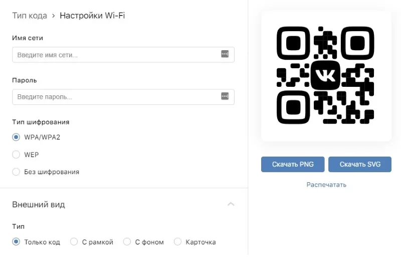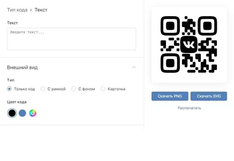 QR-код можно кастомизировать: в случае со ссылкой на сайт или VK-паблик — добавить фон, рамку с подписью, выбрать цвет, убрать иконку VK и вставить собственный логотип. Для других типов данных, которые нужно зашифровать в QR-коде, предусмотрены специальные поля. Такой код можно разместить на сайте, странице в VK или распечатать и использовать на стикерах или визитках.