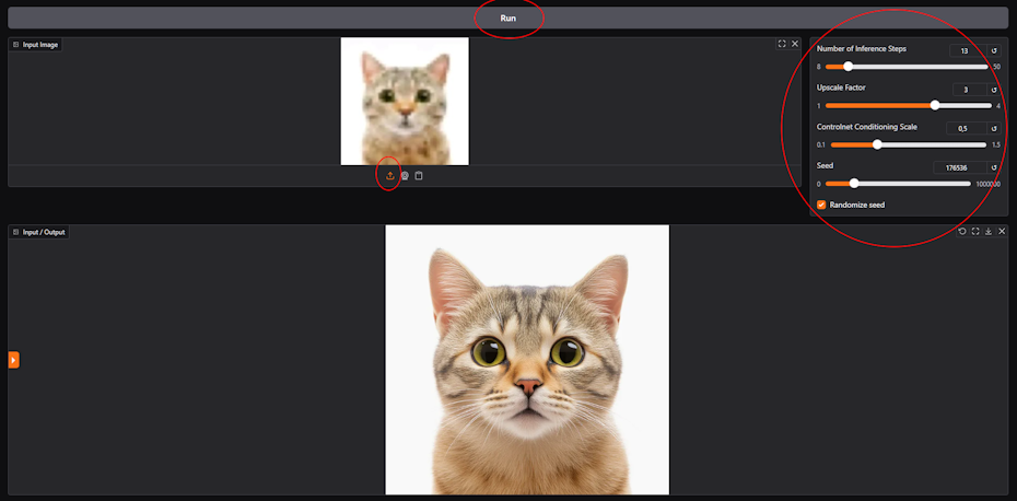 - Зайдите на сайт проекта ControlNet и нажмите на иконку со стрелочкой вверх. Загрузите картинку, качество которой вам нужно повысить.