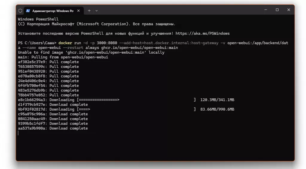 Откройте «Терминал» или командную строку и выполните команду docker run -d -p 3000:8080 --add-host=host.docker.internal:host-gateway -v open-webui:/app/backend/data --name open-webui --restart always ghcr.io/open-webui/open-webui:main