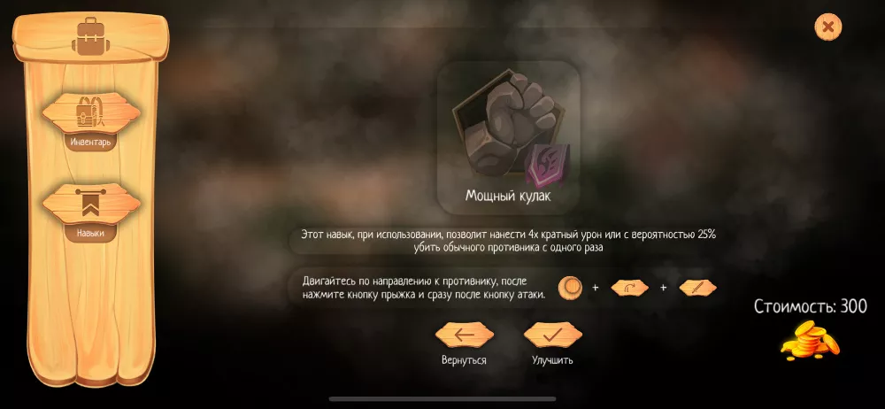 Отдельно стоит сказать про развитие персонажа. Выбора класса нет, поскольку сюжетная линия такого не предусматривает, да и боевая система тоже рассчитана только на одну игровую расу. Впрочем, некоторое разделение в зависимости от личных пристрастий все-таки есть: персонажа можно прокачивать с одноручным или двуручным оружием, а также сочетая легкий меч и щит. Фанатам магов или эльфов на этом моменте можно немного взгрустнуть, но лично я подход разработчиков одобряю. В мобильной игре не обязательно должно быть все то, что мы обычно видим на компьютерах и консолях. Карманный формат всегда должен предполагать возможность быстро достать гаджет, немного поиграть, получить от этого удовольствие и спокойно вернуться к другим делам. В общем, играем за человека драться будем на кулаках, а сражаться на мечах. Постепенно найдем себе приличную экипировку: мощное оружие, щит, шлем, плащ и накидку, накопим разные зелья. При переходе на новый уровень, в зависимости от стратегии, сможем улучшать силу, здоровье и выносливость. А позже — получим доступ к дополнительным полезным навыкам типа быстрого перемещения по карте или шанса на критический удар с повышенным уроном.