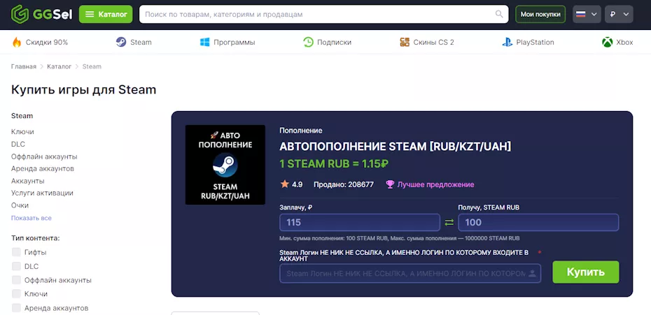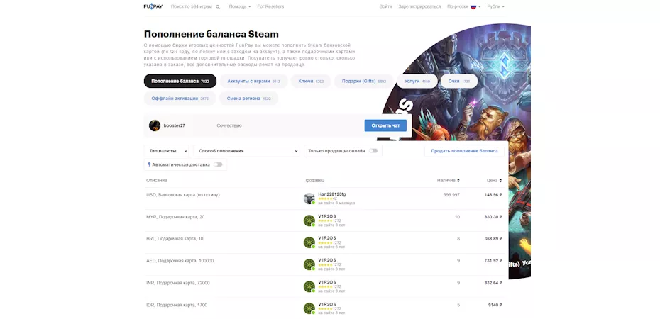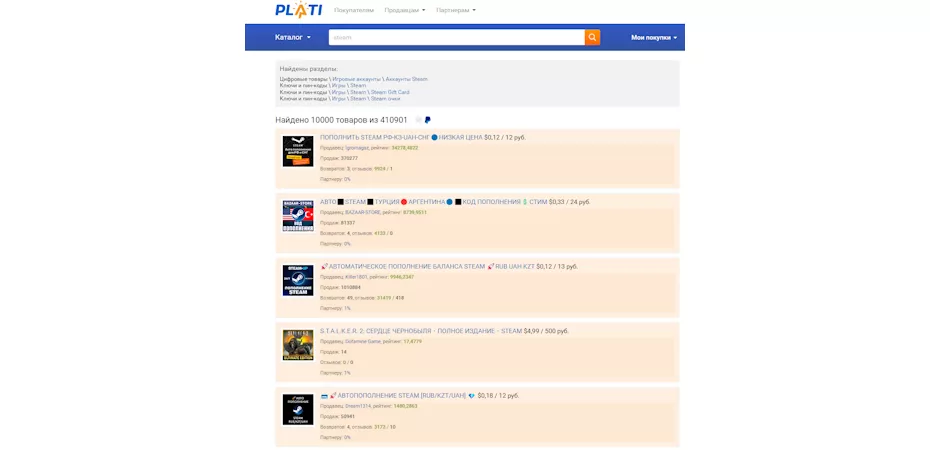 Plati.Market, FunPay, GGSel Эти сайты предлагают посреднические услуги по пополнению кошелька Steam и прочих сервисов. Но те, кто предлагает свои услуги, могут оказаться мошенниками, поэтому этот способ не особо надёжен. Суть услуги везде одинакова: продавцы размещают объявления об услуге, а покупатели приобретают ее. Сумма пополнения с учётом комиссии и прочих сборов может оказаться примерно на четверть меньше той, что вы заплатите сайту.