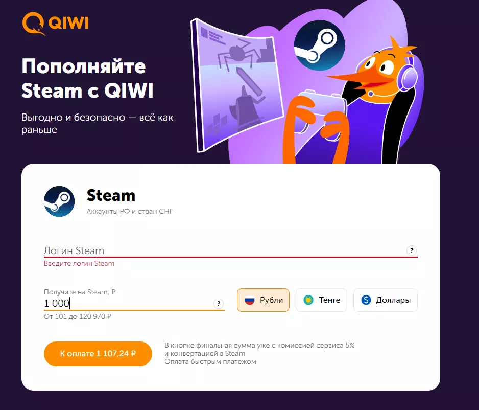 У «Киви Банка» была отозвана лицензия, из-за чего были заблокированы электронные кошельки, но это не помещало владельцам сервиса запустить переводы денег в Steam. Как и в большинстве других мест, предусмотрена комиссия за эту услугу.