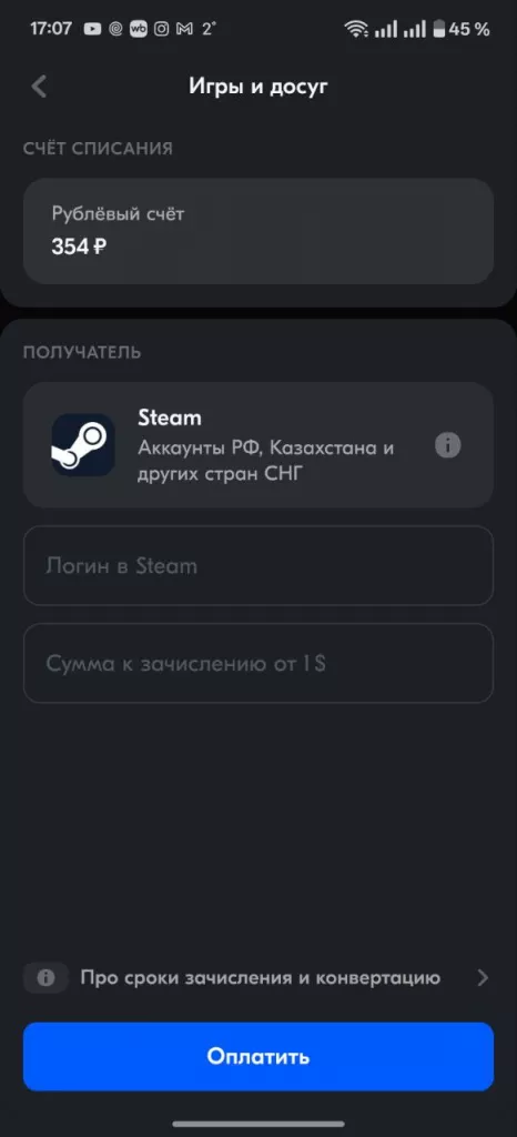 С недавних пор пополнение Steam стало доступно клиентам «Ozon Банка». Для перевода денег нужно зайти в мобильное приложение или на сайт банка, в разделе «Платежи» выбрать услугу «Игры и досуг», а затем Steam. За один раз можно перевести не более 5 тысяч рублей. Комиссии самого банка нет, но происходит двойная конвертация — из рубля в доллар, а затем из доллара в рубль (или другую валюту пополнения). На этом теряется примерно 10% от суммы зачисления в аккаунт.