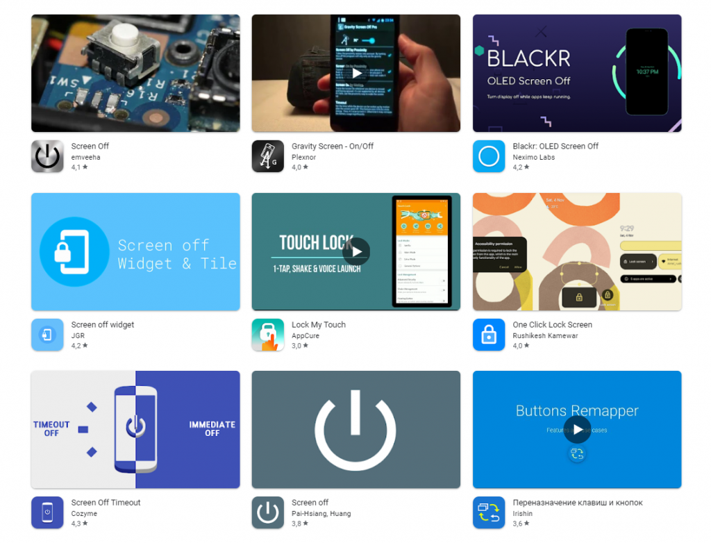 Любой Android-смартфон можно настроить так, чтобы экран выключался не физической кнопкой, а виртуальной — на экране. В Play Маркете доступно несколько приложений, обеспечивающих такую возможность, их можно найти по словам screen off button. Принцип работы у всех один и тот же: устанавливаете, запускаете, предоставляете доступ к управлению системными функциями и размещаете значок или виджет приложения на экране.
