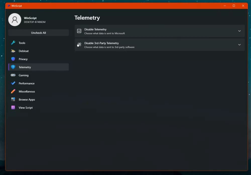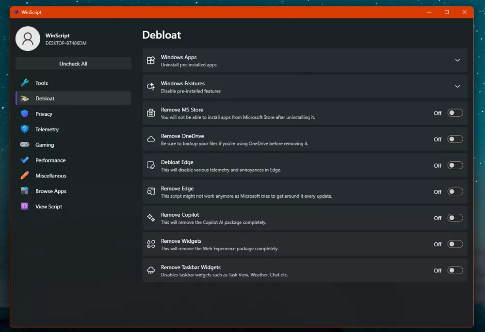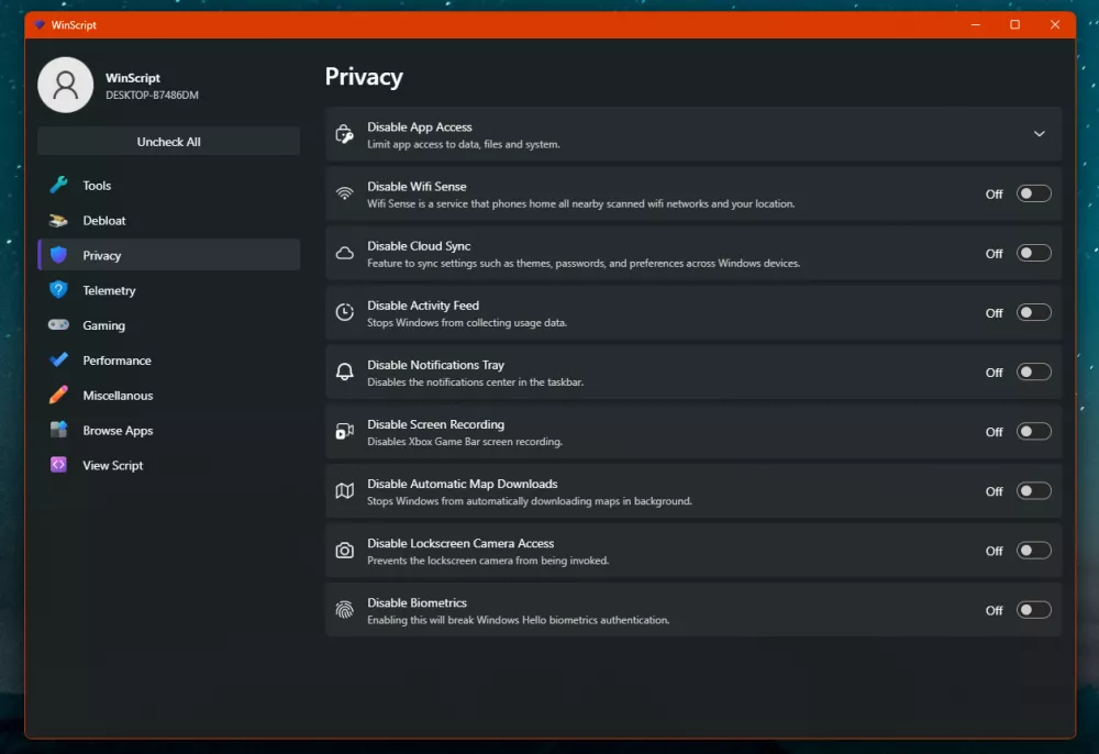 WinScript позволяет запускать встроенные утилиту для очистки накопителя, создания точки восстановления, проверки целостности данных, сброса сетевых настроек и удаления браузерного кэша. Также есть опция удаления встроенных программ и отключения различных компонентов. Можно настроить параметры конфиденциальности, отключить передачу телеметрических данных на сервер Microsoft, отключить оптимизацию игр, а также «поиграть» с параметрами, отвечающими за производительность компьютера (например, отключить изоляцию ядра).