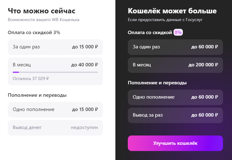 Не исключено, что эта скидка временная и одноразовая, то есть будет действовать только на следующую покупку. Поэтому есть смысл поспешить использовать её и потратить при приобретении каких-нибудь дорогих товаров (особенно, если они давно лежат в отложенном и цены на них сейчас адекватные). Обладателям подтверждённых кошельков доступны повышенные лимиты на оплату через «WB Кошелёк» — до 60 тысяч рублей за раз вместо 15 тысяч и до 200 тысяч рублей в месяц вместо 40 тысяч. Поскольку Wildberries меняет условия оплаты и скидок чуть ли не ежедневно, повышенная скидка за привязку «Госуслуг» может исчезнуть в любой момент.