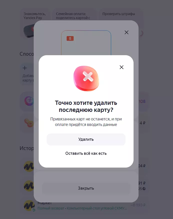 Также есть смысл удалить карты в настройках аккаунта «Яндекса». Совсем недавно «Яндекс» не позволял оставлять учётную запись совсем без карт, но теперь снова можно удалить оттуда все карты. Чтобы не привязывать карту заново всякий раз, когда нужно заплатить, можно установить на ней небольшой лимит (например, 10 рублей) и увеличивать перед очередным платежом, а затем возвращать обратно к минимальному значению.
