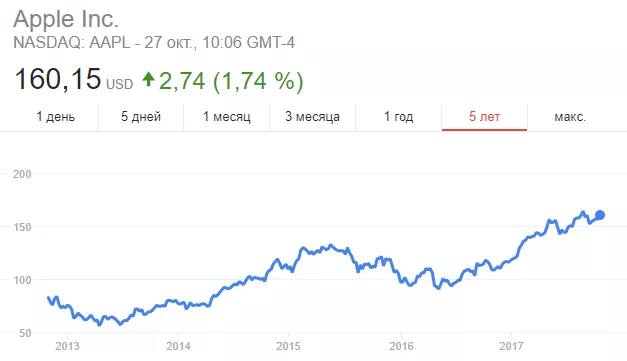 Акции Apple стоят по 160 долларов за штуку, и по прогнозам аналитиков в ближайшие месяцы вырастут в цене до 170-200 долларов. На 80 тысяч рублей вы можете приобрести 8 акций (и ещё останется 5300 рублей), а на 92 тысячи — 10 акций (если добавите 800 рублей). Конечно, ничто не помешает вам приобрести ценные бумаги какой-нибудь другой компании, тем более, что ваш отказ от iPhone X негативно повлияет на котировки Apple.