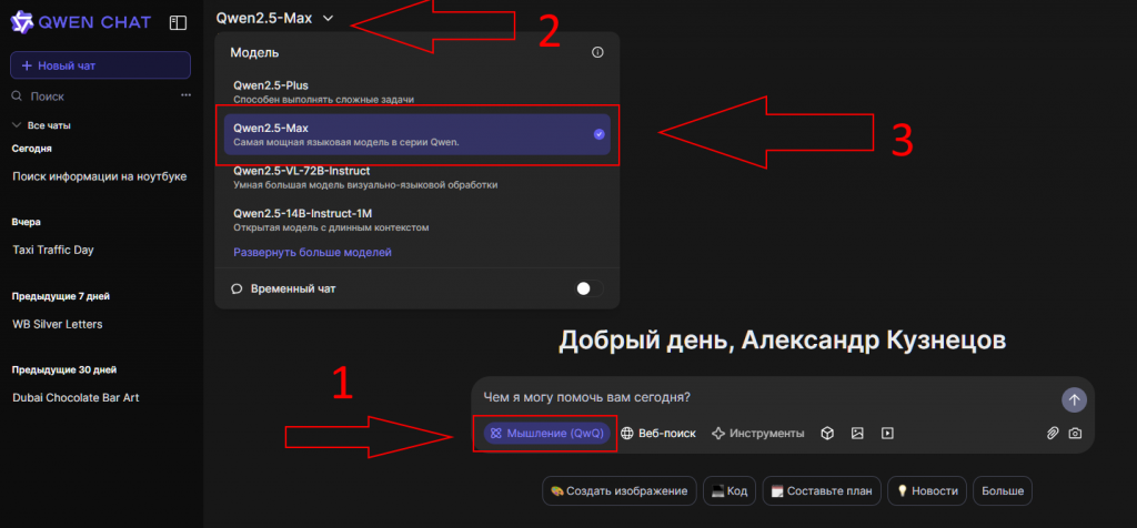 Qwen Chat работает в России и поддерживает русский язык. Для использования QwQ-Max нужно переключить чат бот в режим «Мышление» и выбрать в качестве модели Qwen2.5-Max.