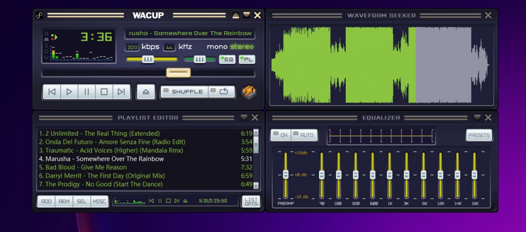 Даррен интегрировал в свой мод множество плагинов, причём подобрал их так, что они не конфликтуют друг с другом, а это огромная работа. Конечно, интуитивность работы с плагинами никогда не была сильной стороной Winamp, что неудивительно, ведь они создавались разными людьми, а у каждого разработчика свои представления о том, что удобно и логично, а что нет. В WACUP примерно в три раза больше настроек, чем в Winamp, причём в плеер изначально встроены возможности, которые раньше приходилось добавлять вручную, например, скробблинг в last.fm (если ещё кто-то помнит, что это и для чего оно нужно), вещание интернет-радиостанций, автоматическое воспроизведение при запуске плеера, работа с zip-архивами, запуск плейлиста по расписанию в определённое время, отображение волновой формы трека, разделители папок в плейлисте, скачивание обложек к альбомам и текстов песен.