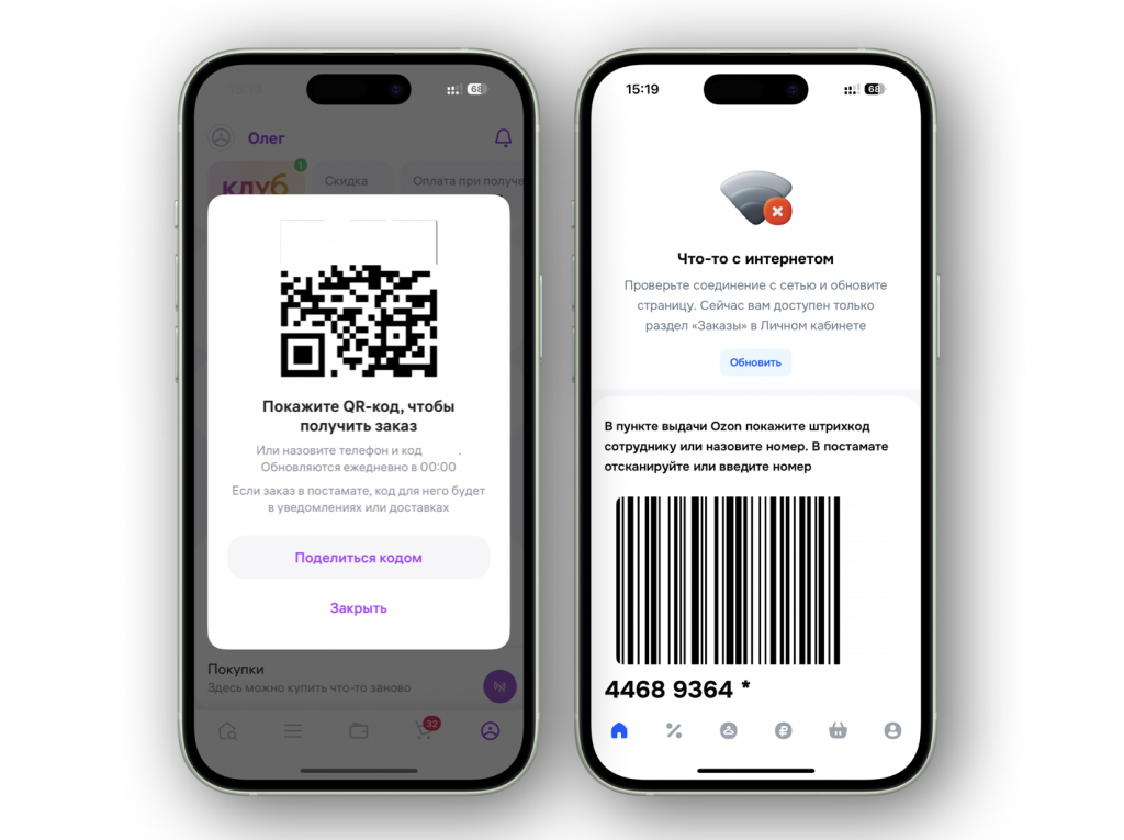 - Забрать заказ. Последние версии приложений OZON и Wildberries позволяют вывести на экран актуальный код для выдачи заказа даже без интернета. Но если сомневаетесь, можно заранее дома сделать скриншот кода — только учтите, что код обновляется раз в сутки. Также можно заранее заскринить карточку товара с деталями, например, точный вес продукта или комплектацию. Если была выбрана оплата при получении, то заранее дома переведите на OZON-карту или WB-кошелек нужную сумму.