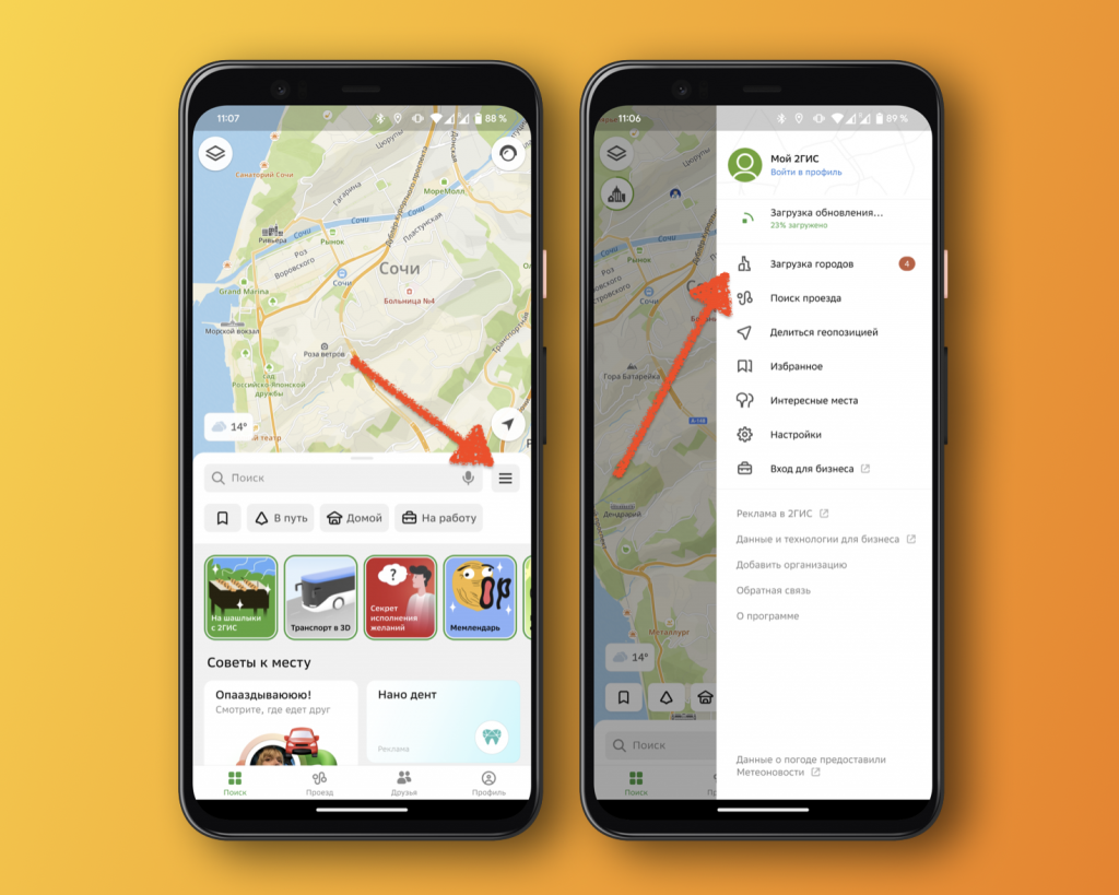 Большинство картографических приложений позволяют скачать свою местность заранее и пользоваться навигацией без активного интернета. Во всех случаях уровень доступности функций будет разный, но вы в любом случае сможете сориентироваться на местности.- 2ГИС. Чтобы скачать карту, откройте приложение, нажмите «три полоски» и выберите «Загрузка городов». Наберите в поиск свой город или регион и дождитесь скачивания. Приложение предложит скачать ту местность, в которой вы находитесь.