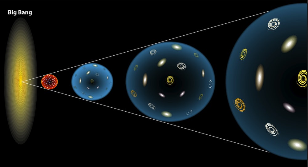 Основной теорией появления вселенной является Большой Взрыв, который произошел порядка 13.7 млрд лет назад, и с тех пор вселенная непрерывно расширяется. До запуска «Хаббла» астрономы полагали, что расширение со временем замедляется из-за гравитационных сил, однако, наблюдая за сверхновыми и оценивая расстояние до них, телескоп смог определить, что их галактики продолжают разбегаться ускоренно. И в итоге оказалось, что вместо того, чтобы замедляться, скорость расширения наоборот увеличивается. Для объяснения этого факта в космологическое уравнение состояния была добавлена новая переменная, называемая темной энергией, которая обеспечивает отрицательное давление и тем самым объясняет дальнейшее ускорение разлета галактик.