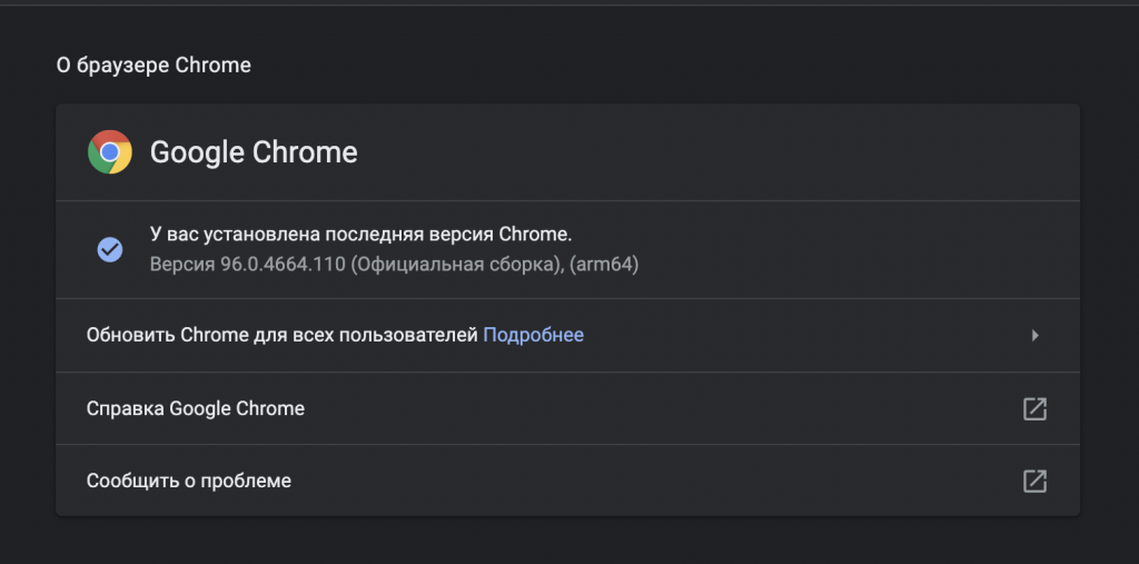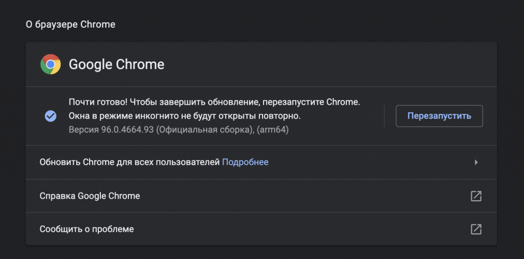 Патч имеет номер 96.0.4664.110 и был выпущен для настольных операционных систем Windows, macOS и Linux. Обычно Chrome устанавливает обновления автоматически, но можно сделать это и вручную: для этого откройте вкладку «О браузере Chrome» в диалоговом меню браузера и нажмите «Проверить обновления», а потом «Перезапустить».