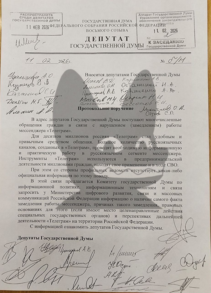Группа депутатов Государственной думы внесла протокольное поручение с требованием запросить у Минцифры информацию о замедлении работы Telegram. Авторами инициативы выступили 15 парламентариев от КПРФ и двое от «Справедливой России». Документ будет направлен в комитет по информационным технологиям и, если поручение будет принято на сегодняшнем заседании, его направят в министерство.