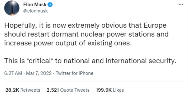 Неожиданно для всех, Илон Маск сообщил в своем Twitter-аккаунте о надежде на возрождение ядерной энергетики. По его мнению, Европа должна «перезапустить» атомные электростанции и увеличить мощность тех, что находятся в действии в данный момент.