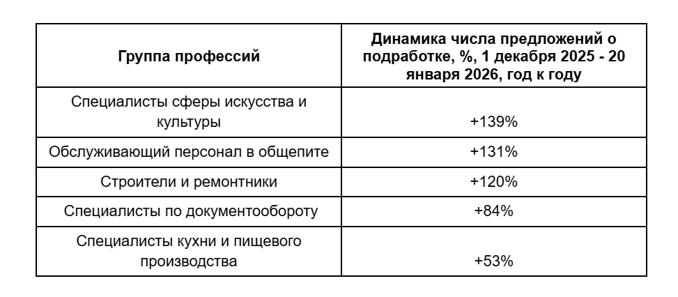 Как изменилось число предложений о подработке, доступных в том числе студентам, 1 декабря 2025 — 20 января 2026, год к году