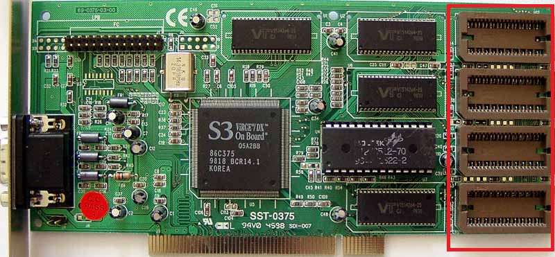 Характеристики же ее были достаточно скромны — частота видеочипа была порядка 60 МГц, а памяти было до 4 МБ, причем память можно было наращивать самому. Да-да, на видеокарте было распаяно 2 МБ и были слоты, куда можно было вставить еще 2: