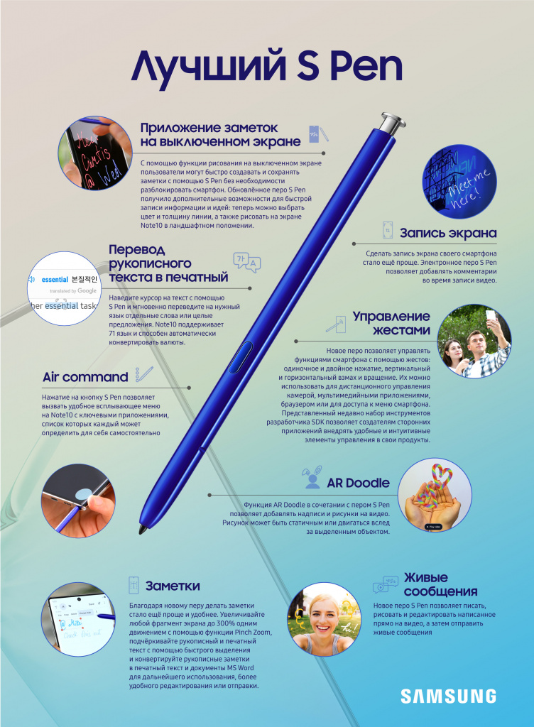 Электронное перо S Pen, представленное в августе, распознаёт 4096 степеней нажатия и позволяет дистанционно управлять смартфоном с помощью жестов: переключаться между слайдами презентации, создавать снимки, ставить на паузу музыку и совершать другие действия. К примеру, если повернуть S Pen по часовой или против часовой стрелки, можно изменить угол съемки, снять сцену крупным планом или захватить панораму целиком. Конвертация текста позволяет переводить рукописные заметки в текст в нужном формате, а «дудлы в дополненной реальности» делают видео эмоционально более насыщенным. 6 минут заряда хватает на 10 часов использования.