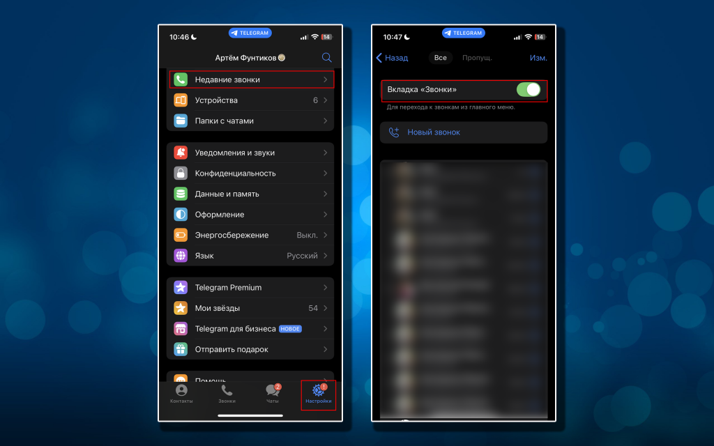Вкладка «Звонки» может пригодиться тем, кто часто созванивается внутри мессенджера. С ее помощью можно открыть журнал входящих/исходящих и пропущенных вызовов. Если услуга связи внутри Telegram не требуется, то соответствующую кнопку можно скрыть, отдав приоритет только нужным иконкам. Вот как это сделать.