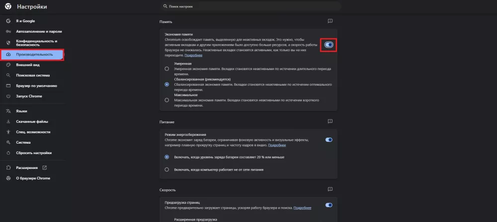 - Сбалансированный — стандартный режим с оптимальным сроком работы вкладок