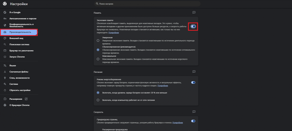 - Во вкладке «Память» переключаем тумблер «Экономии памяти».