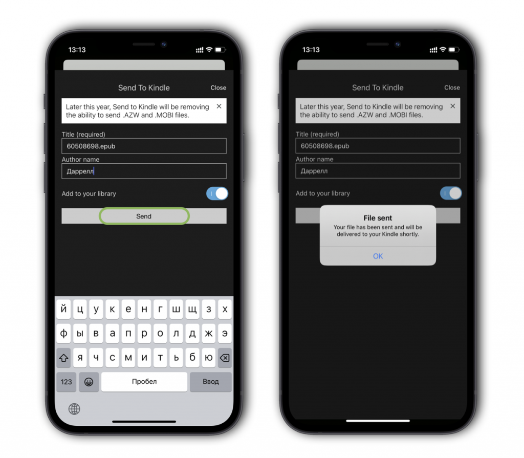 Готово! Теперь можно отправлять книгу. Найти email-адрес для отправки книг (он называется Send-to-Kindle) можно прямо в Kindle: