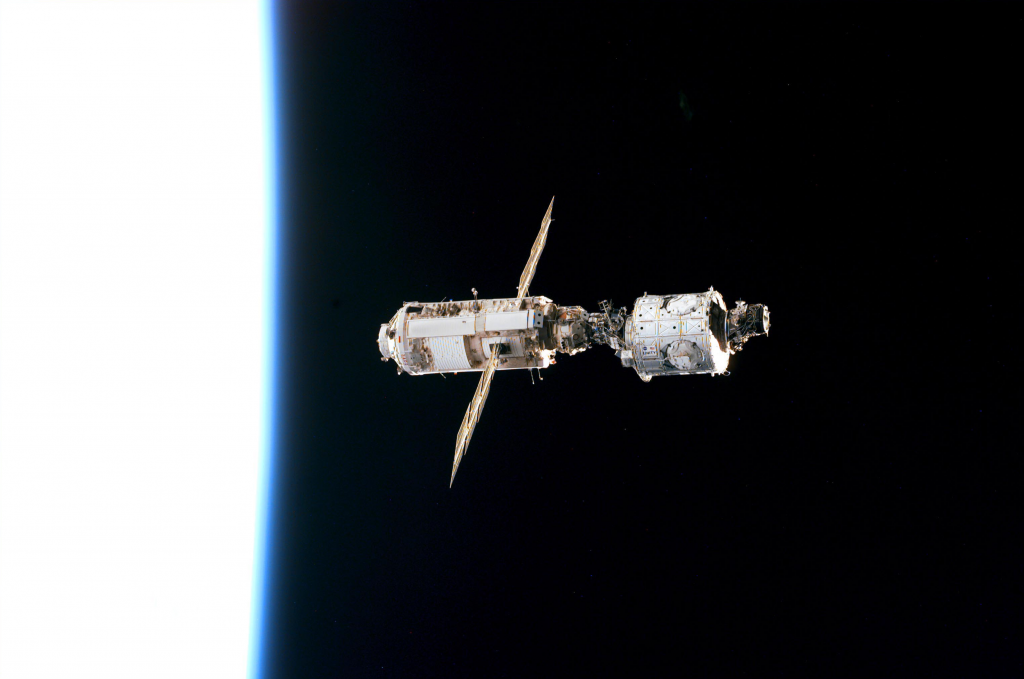 Российский модуль «Заря» и американский модуль «Дестини» на орбите в 1998 году, вскоре после того, как последний был выгружен из грузового отсека космического шаттла «Индевор»: