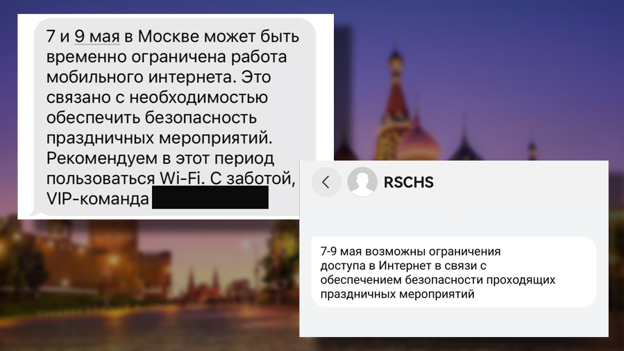 «С 7 по 9 мая в Москве может быть временно ограничена работа мобильного интернета. Это связано с необходимостью обеспечить безопасность праздничных мероприятий. Рекомендуем на этот период пользоваться Wi-Fi», — говориться в одном из сообщений.