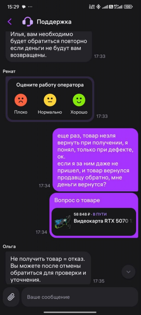 Среди товаров, которые нельзя не получать, оказалась, к примеру, видеокарта за 58 с лишним тысяч рублей. В поддержке Wildberries покупателю заявили, что возврата денег не будет, если он не придёт за ней на ПВЗ или придёт, но откажется забирать её.
