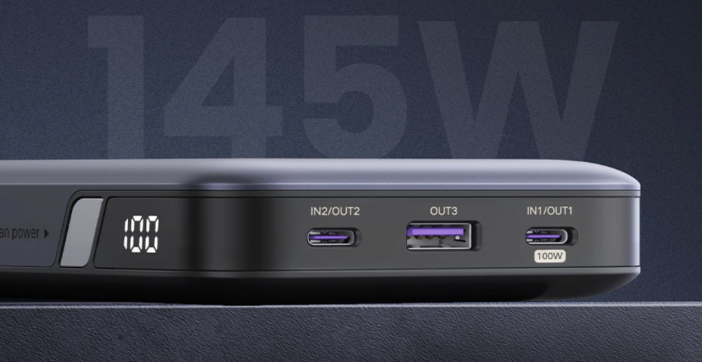 Powerbank от UGREEN способен заряжать устройства суммарной выходной мощностью до 145 Ватт. Он оснащен двумя портами USB-C, один из которых выдает до 100 Ватт и с легкостью зарядит даже 16-дюймовый MacBook Pro. Второй Type-С обеспечит до 45 Ватт мощности, а единственный USB-A — до 18 Ватт. Аксессуар поддерживает все популярные стандарты быстрой зарядки.