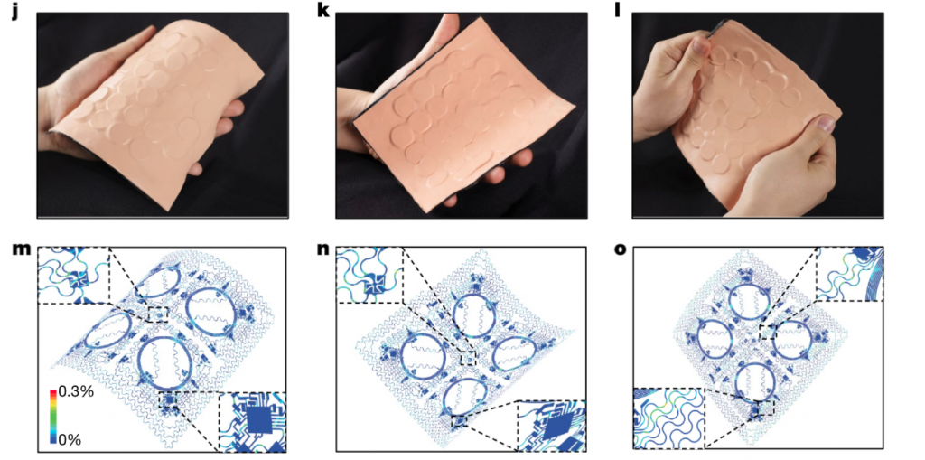 Конечный продукт выглядит как легкий и мягкий кусок материала, подобного ткани, который может сгибаться и скручиваться, поддерживая прямой контакт с кожей пользователя при движении его тела, как гидрокостюм. Он состоит из тонких слоев электроники, зажатой между защитными силиконовыми листами. Один из слоев предназначен для получения энергии с помощью технологии NFC.