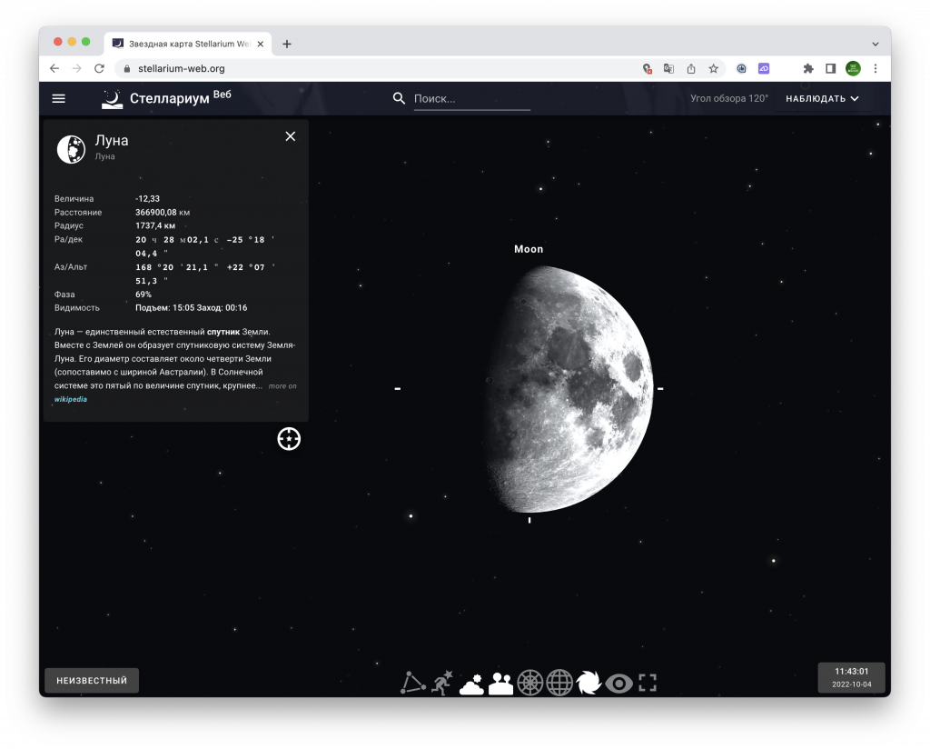 Помимо перечисленных выше объектов, вы можете в реальном времени видеть передвижение спутников Starlink. Смена расположения Луны и звезд относительно Земли тоже динамически обновляется — данные можно увидеть, кликнув на интересующий вас объект. Во всплывающем окне можно прочесть основную информацию о небесном теле.
