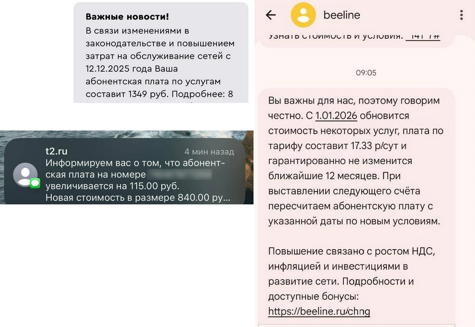 Российские операторы сотовой связи и провайдеры интернета начали рассылать абонентам уведомления о пересмотре тарифов. Повышение затронет как мобильную, так и проводную связь. Новые расценки вступят в силу с января 2026 года, а в некоторых случаях даже раньше.
